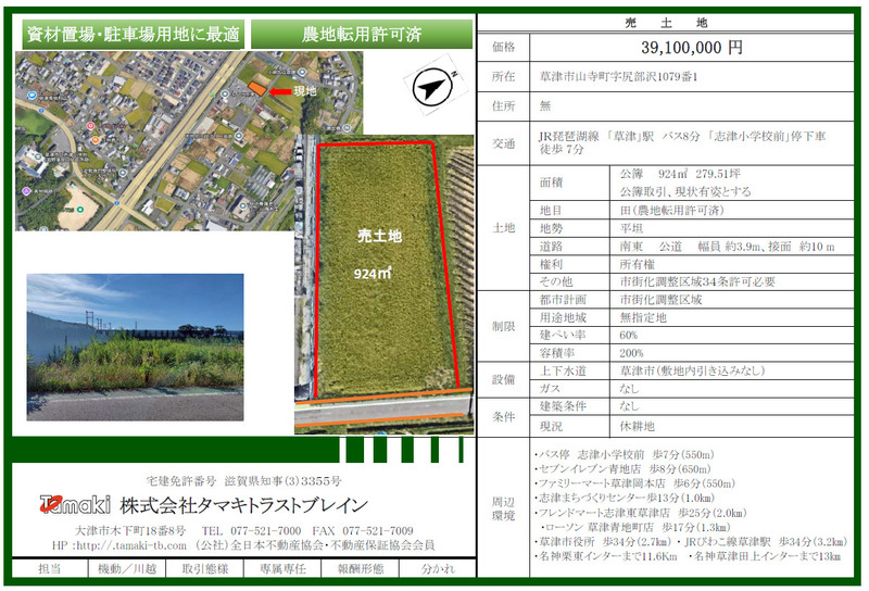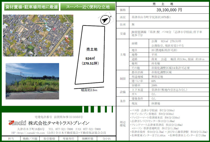 草津市山寺町(草津駅)駐車場用地 草津市山寺町 琵琶湖線 草津駅 志津小学校前 バス8分 徒歩7分 | 3,910万円 13.99万円/坪 | 60% 200% | 924㎡ 279.5坪 なし | 現況渡し 駐車場用地 | ||