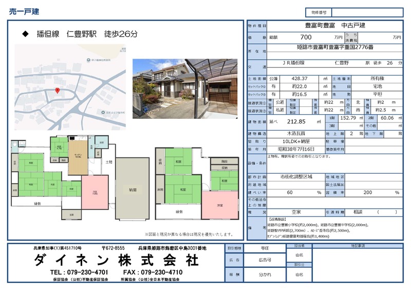 豊富町豊富 中古戸建 姫路市豊富町豊富 JR播但線 仁豊野駅 徒歩26分 | 700万円 | 10LDK 壁芯 212.85㎡ | 公簿 428.37㎡ | 戸建住宅 1963年7月16日(築62年5ヶ月) | ||