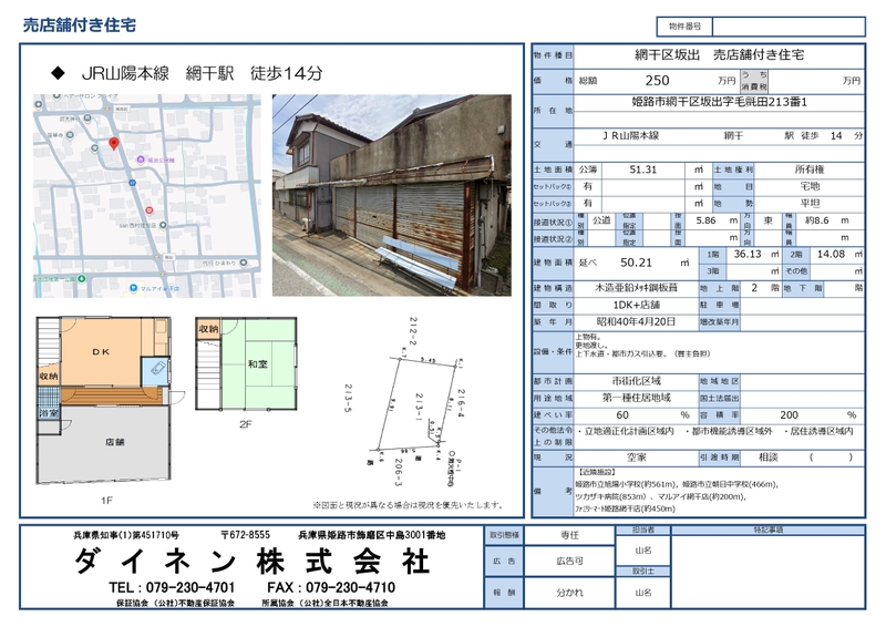 網干駅 14分 姫路市網干区坂出 JR山陽本線(姫路~岡山) 網干駅 徒歩14分 | 250万円 | 1DK 壁芯 50.21㎡ | 公簿 51.31㎡ | 戸建住宅 1965年4月20日(築60年8ヶ月) | ||