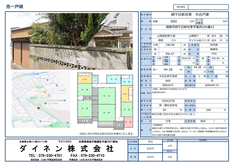 山陽網干駅 20分 姫路市網干区新在家 山陽電鉄網干線 山陽網干駅 徒歩20分 | 400万円 | 6K 壁芯 94.28㎡ | 公簿 198㎡ | 戸建住宅 1956年1月(築70年0ヶ月) | ||