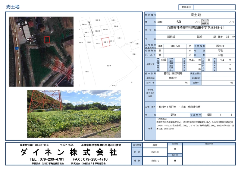 神崎郡市川町西田中(福崎駅)住宅用地 神崎郡市川町西田中 JR播但線 福崎駅 徒歩35分 | 60万円 1.87万円/坪 | 106.58㎡ 32.24坪 | 現況渡し 住宅用地 | |||
