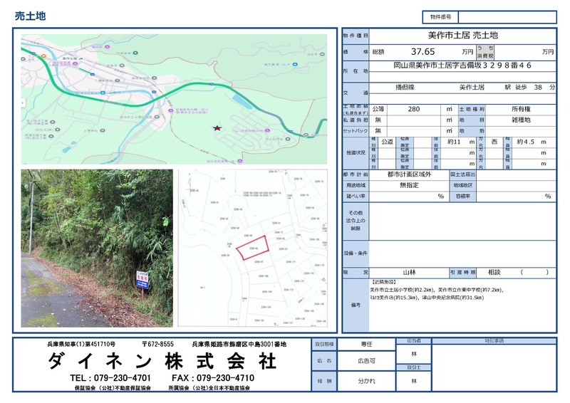 美作市土居(美作土居駅)リゾート向 美作市土居 JR姫新線(佐用~新見) 美作土居駅 徒歩38分 | 37.65万円 0.45万円/坪 | 280㎡ 84.69坪 | 相談 リゾート向 | |||