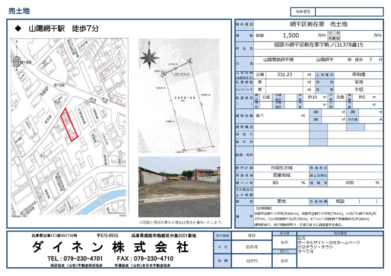 姫路市網干区新在家(山陽網干駅)住宅用地 姫路市網干区新在家 山陽電鉄網干線 山陽網干駅 徒歩7分 | 1,500万円 14.98万円/坪 | 80% 400% | 331.23㎡ 100.19坪 なし | 相談 住宅用地 | ||