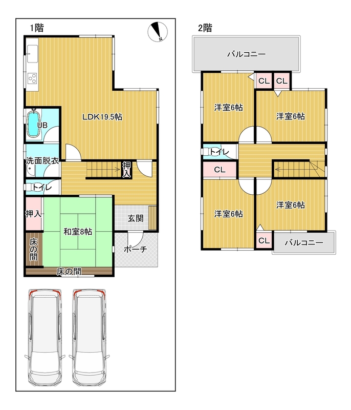 - 都市ガス 排水下水 駐車場2台分 閑静な住宅街 水道公営 トイレ2ヶ所 追焚機能 浴室1坪以上 洗面台 三面鏡付き洗面化粧台 洗面所 洗濯機置場 システムキッチン コンロ3口以上 給湯 食器洗浄乾燥機 収納スペース シューズボックス 全室収納 モニタ付インターホン フローリング 和室 バルコニー 二面バルコニー 庭