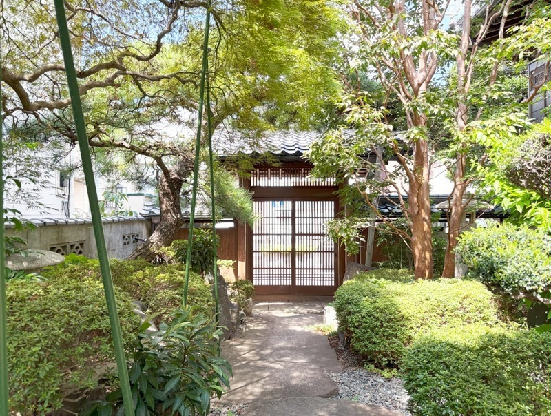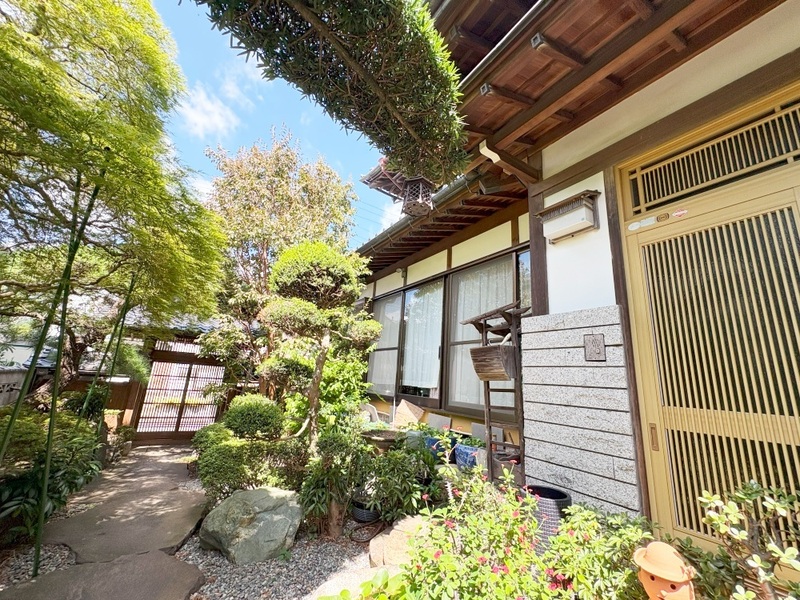 物件外の玄関周辺の様子です。植栽や石畳が日本らしい落ち着いた雰囲気を造り出しています。