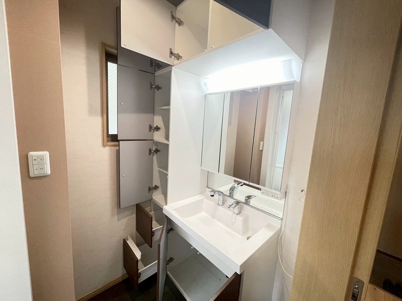 1F洗面室。三面鏡のシャワー付き洗面化粧台!