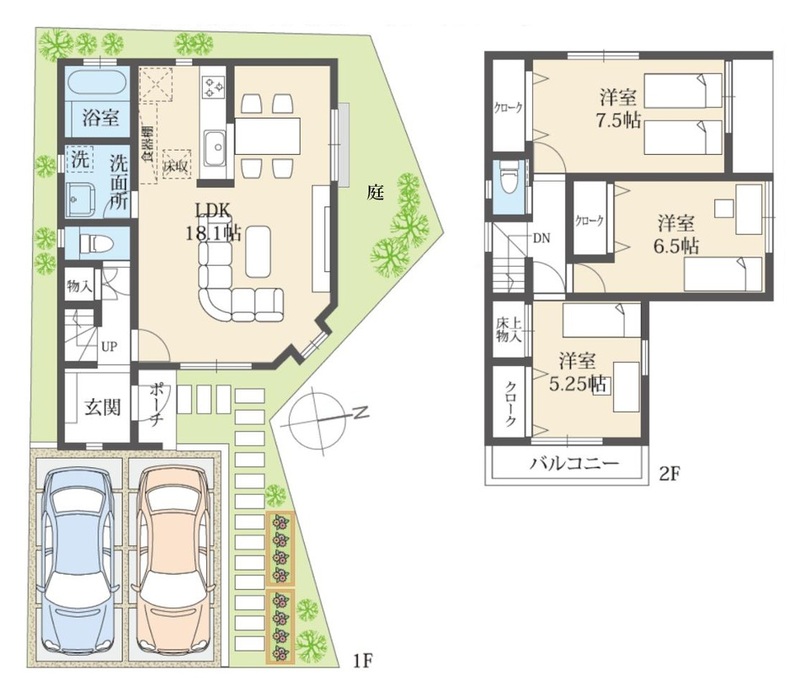 - LDK 1階 18.1帖 洋室 2階 7.5帖 洋室 2階 6.5帖 洋室 2階 5.25帖