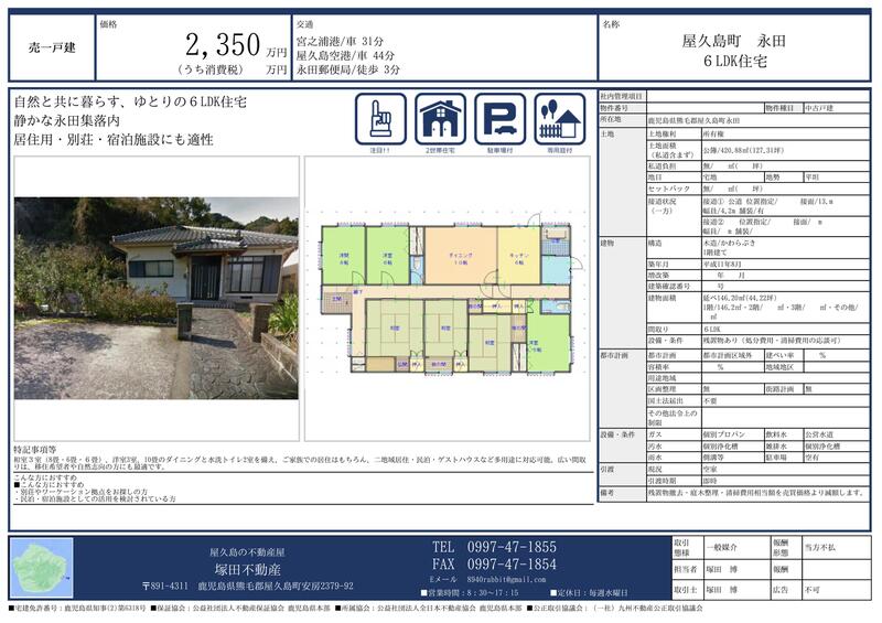 おすすめポイント世界自然遺産の島・永田で暮らすという選択。 屋久島町永田地区。 海と山に抱かれた静穏なロケーションに建つ、6LDKのゆとりある中古戸建。 移住・二拠点生活・保養拠点・民泊転用など、 多用途に応える間取り構成です。