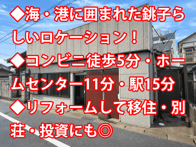 おすすめポイント◆海・港に囲まれた銚子らしいロケーション! ◆コンビニ徒歩5分・ホームセンター11分・駅15分 ◆リフォームして移住・別荘・投資にも◎