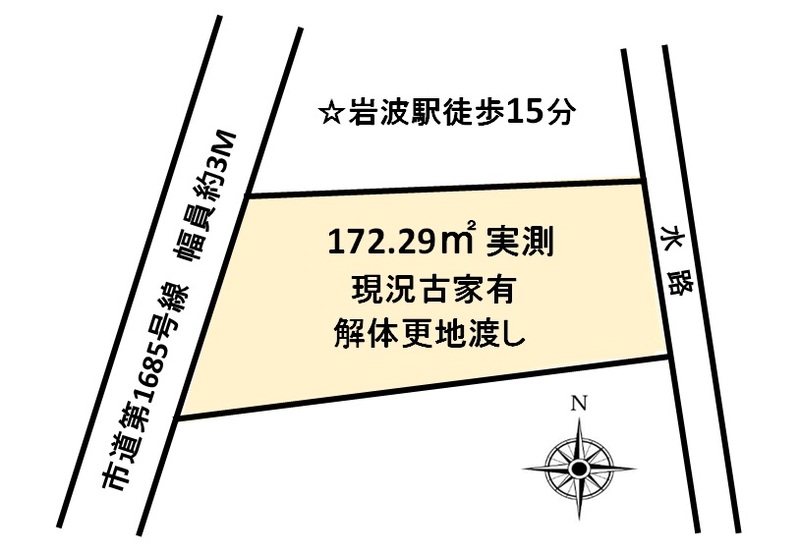 - 法令等制限: ※確定測量済 ※線引き前宅地(既存集落内の宅地の利用) ※一部がけ条例(東南側河川対側地ブロック及び擁壁:河川の存在により一定の緩和を検討できる場合有) ※契約不適合責任免責