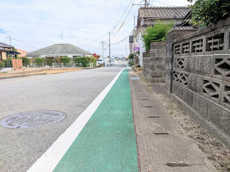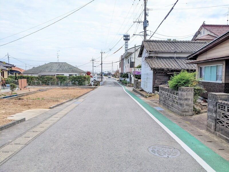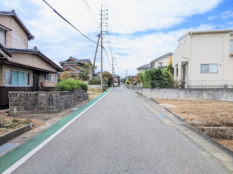 敷地北、東西に延びる道路を西から。前面道路幅員は約5.5mです。