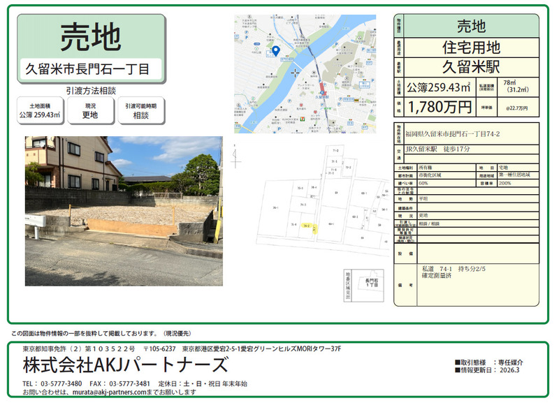 久留米市長門石1丁目(久留米駅)住宅用地物件画像数2周辺画像数0動画数01,765万円坪単価:22.5万円/坪土地面積259.4㎡坪数78.46坪私道負担面積土地権利所有権引渡条件更地渡し最適用途住宅用地建ぺい率60%容積率200%所在地久留米市長門石1丁目交通JR鹿児島本線(博多~八代) 久留米駅 徒歩17分不動産会社:(株)AKJパートナーズ 詳細を見るとりあえず保存お問合せ(無料)