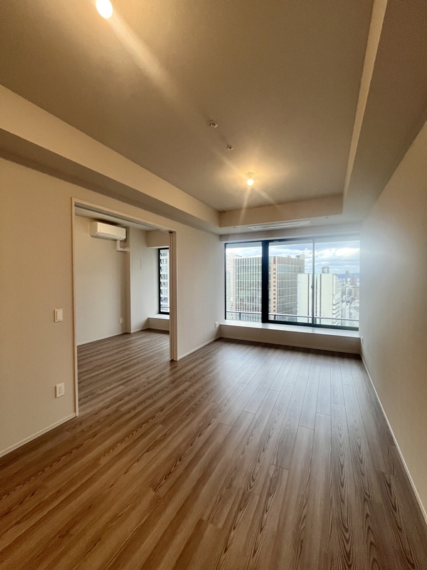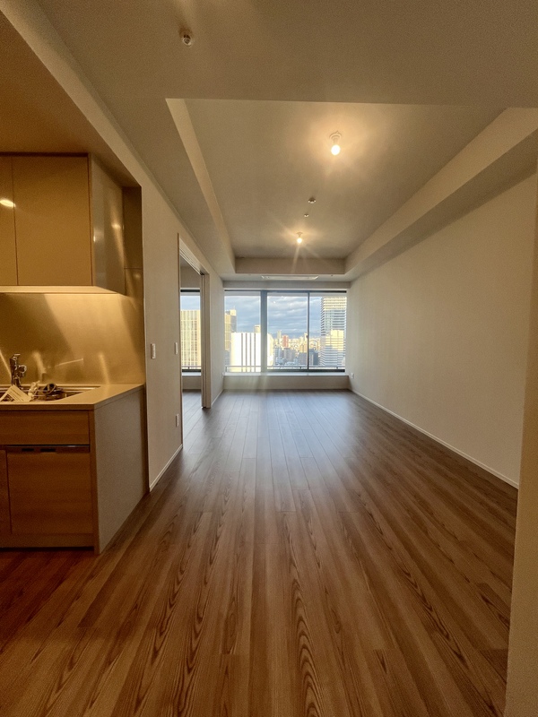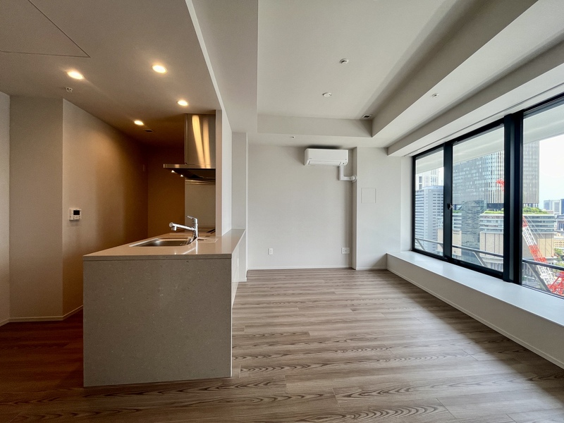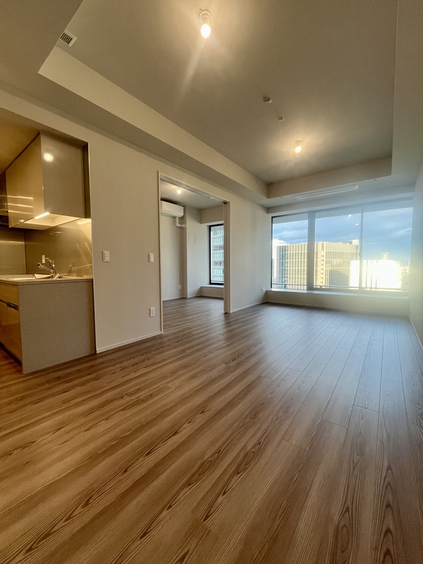 東向き・前面建物なしの開放的な眺望。 天井高約2.8mの伸びやかな空間に、天井カセットエアコン2基と床暖房を備えた上質なリビングダイニング。