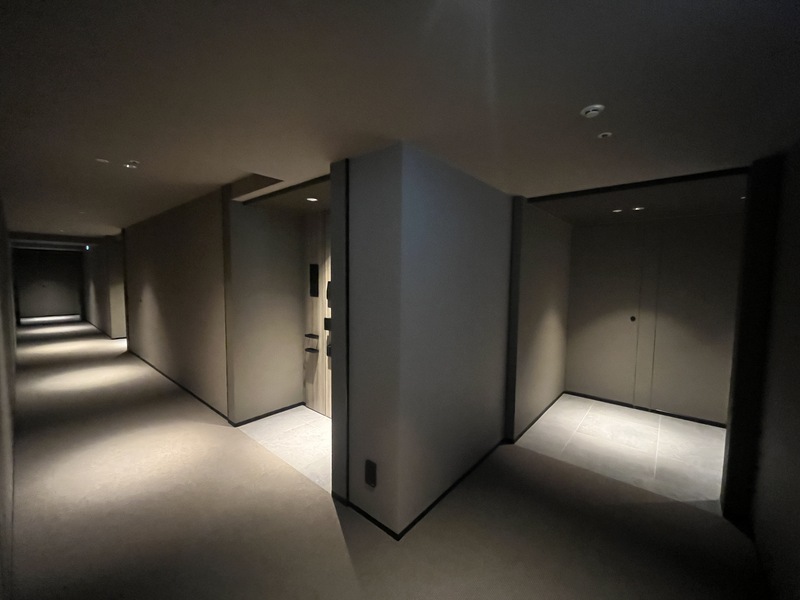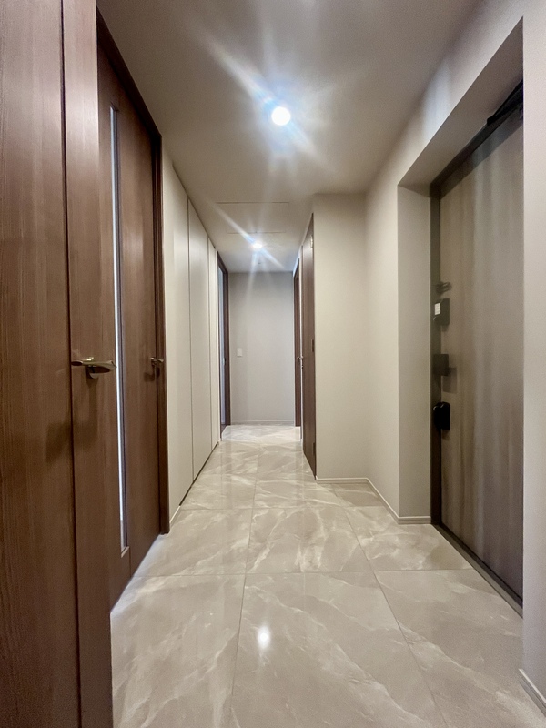 玄関・廊下は大理石調タイル仕上げ。 廊下にも大型収納を備え、住まい全体にホテルライクな印象を与えます。