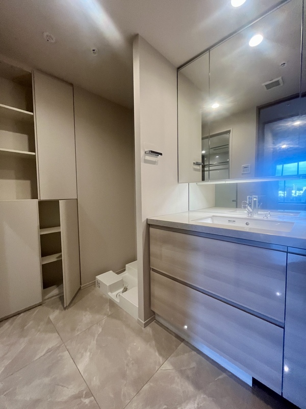 三面鏡洗面台とゆとりあるカウンターを備えた洗面空間。 収納力にも優れ、朝の身支度も快適に。