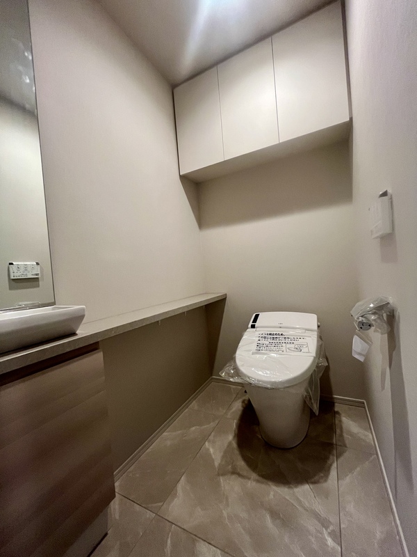 手洗いカウンター付きのタンクレストイレ。 空間にゆとりと清潔感をもたらす設計です。