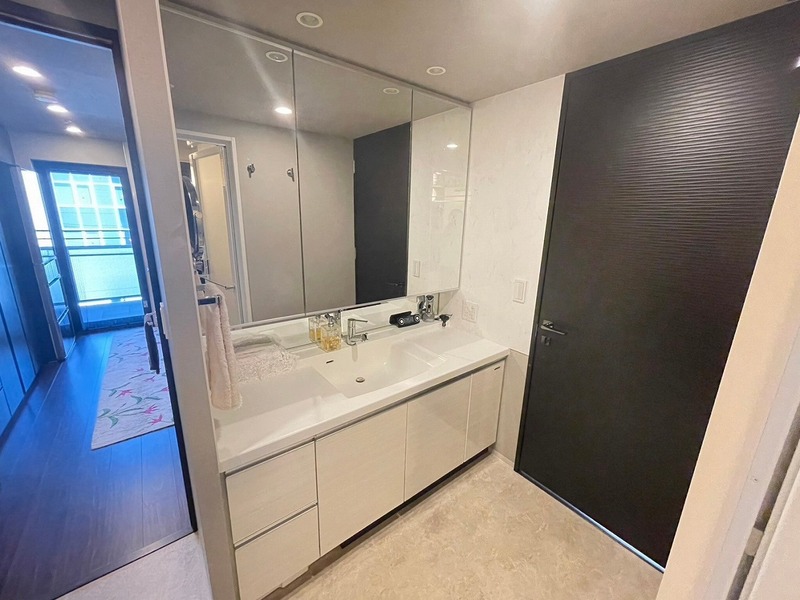 三面鏡の広々としたシャワー付き洗面化粧台!収納スペースもたっぷりございます♪