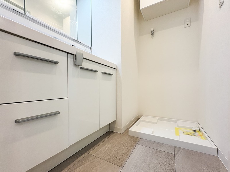 三面鏡の独立洗面台です♪白を基調としており清潔感のある空間です☆