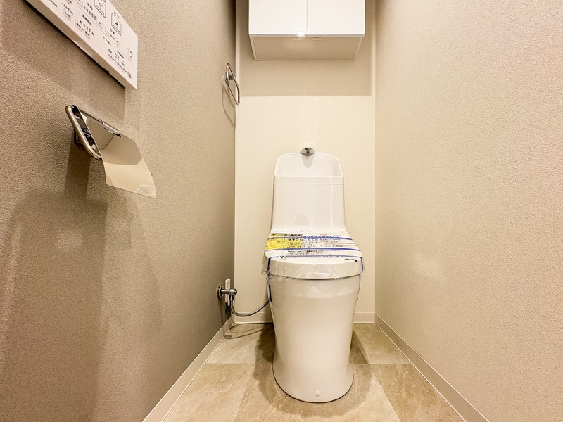 温水洗浄便座完備しております。上部戸棚付きで日用品や清掃用品の収納に♪