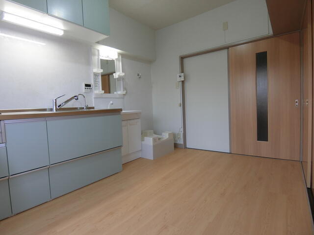 建具・床・システムキッチン・シャワー付き化粧洗面台・室内洗濯機置場新設です。