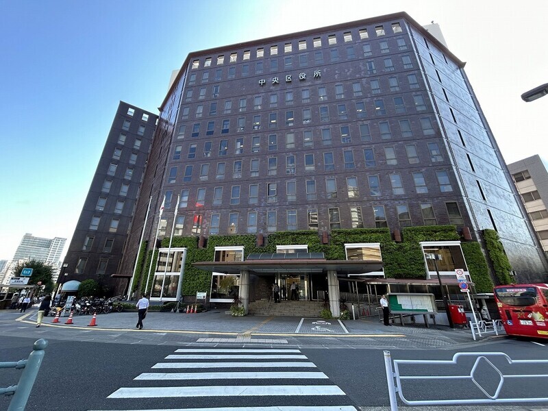 最寄り駅(新富町駅)の正面には中央区役所があります。
