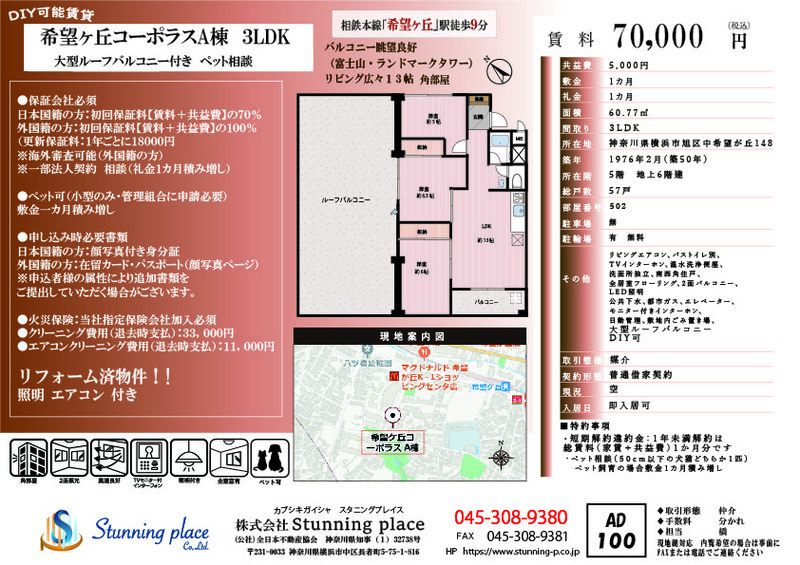 希望ヶ丘コーポラスA棟 502物件画像数2周辺画像数0動画数07万円管理費等:4,545円敷金7万円礼金7万円保証金なし間取3LDK専有面積壁芯 60.77㎡構造鉄骨造物件種目マンション階建/階6階建/5階築年月1976年2月(築50年0ヶ月)所在地横浜市旭区中希望が丘交通不動産会社:(株)Stunning place 詳細を見るとりあえず保存お問合せ(無料)