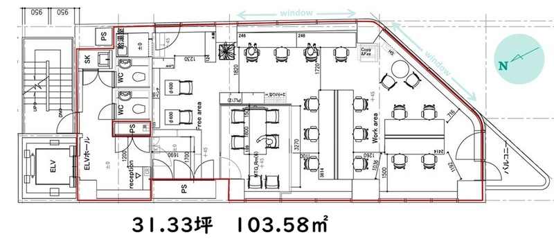 使用部分面積103.58㎡ 坪数31.33坪 坪単価2.76万円/坪/坪 | 駐車場なし 物件種目事務所(一部) 築年月1992年1月(築34年1ヶ月) |
