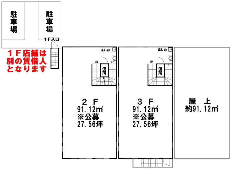 使用部分面積壁芯 91.12㎡ 坪数27.56坪 坪単価0.4万円/坪/坪 | 物件種目店舗・事務所(一部) 駐車場空きあり 無料/月 |